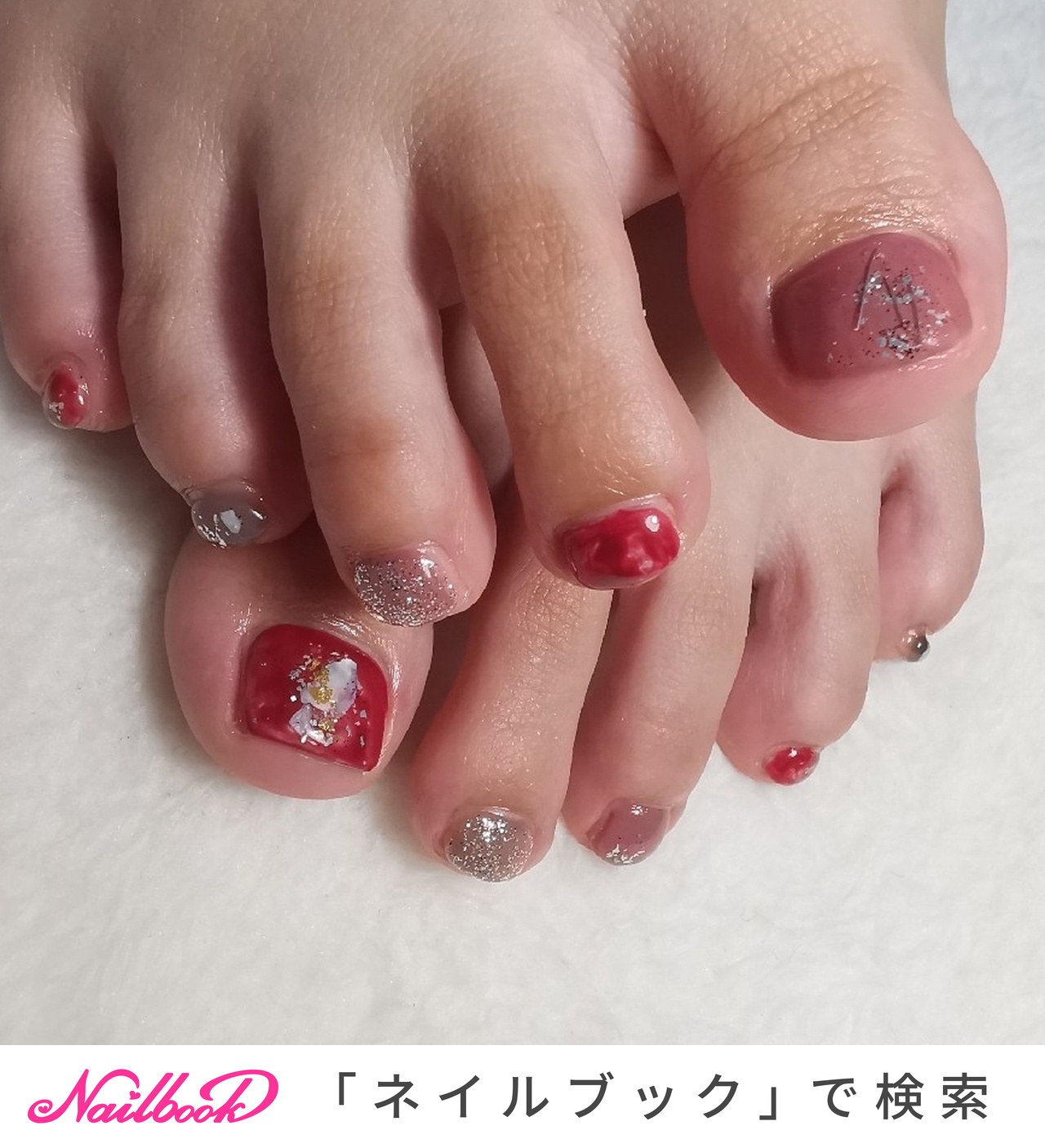 レッド グレー ペディキュアのネイルデザイン ネイルブック